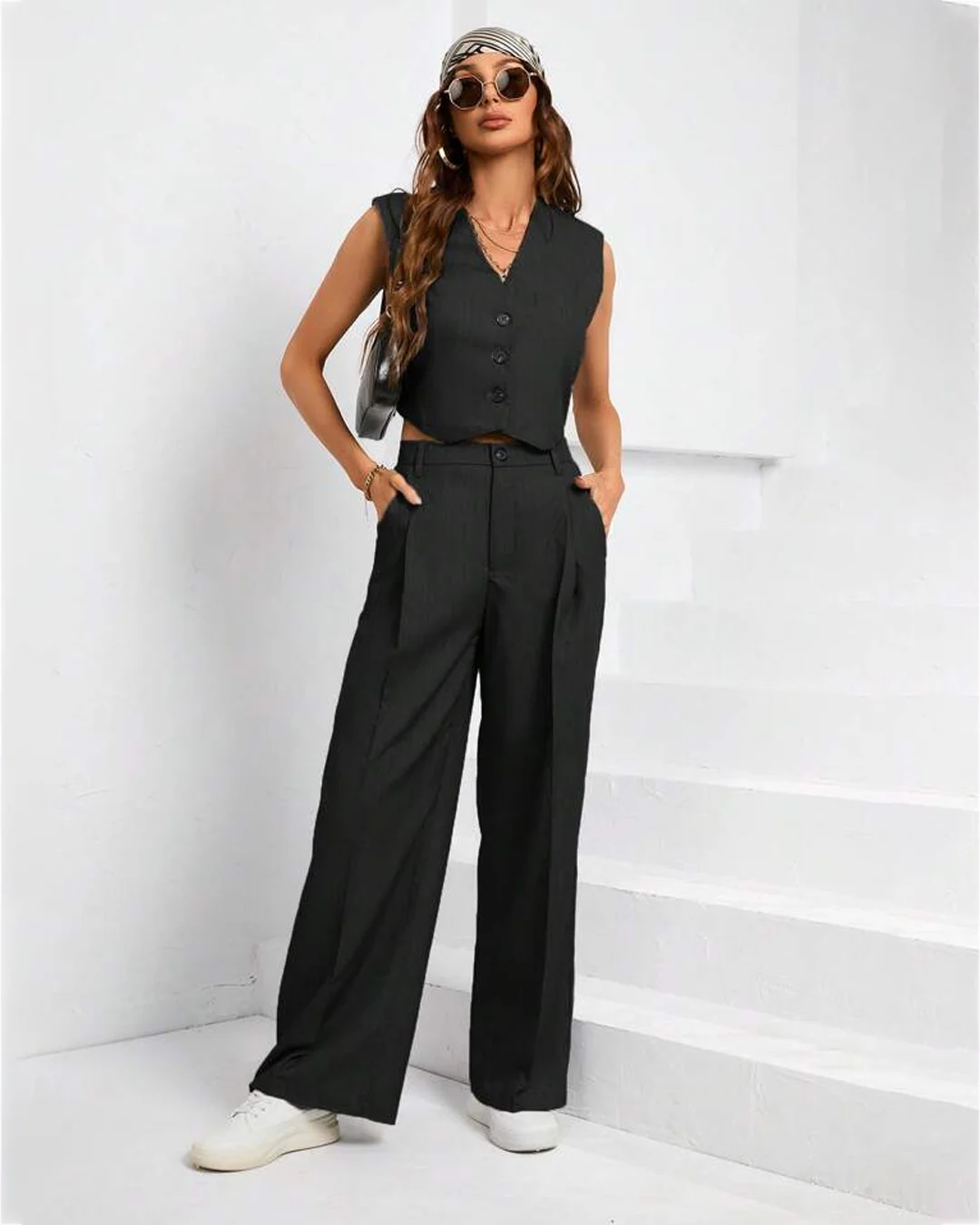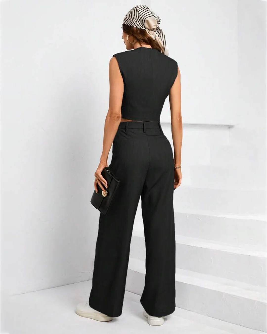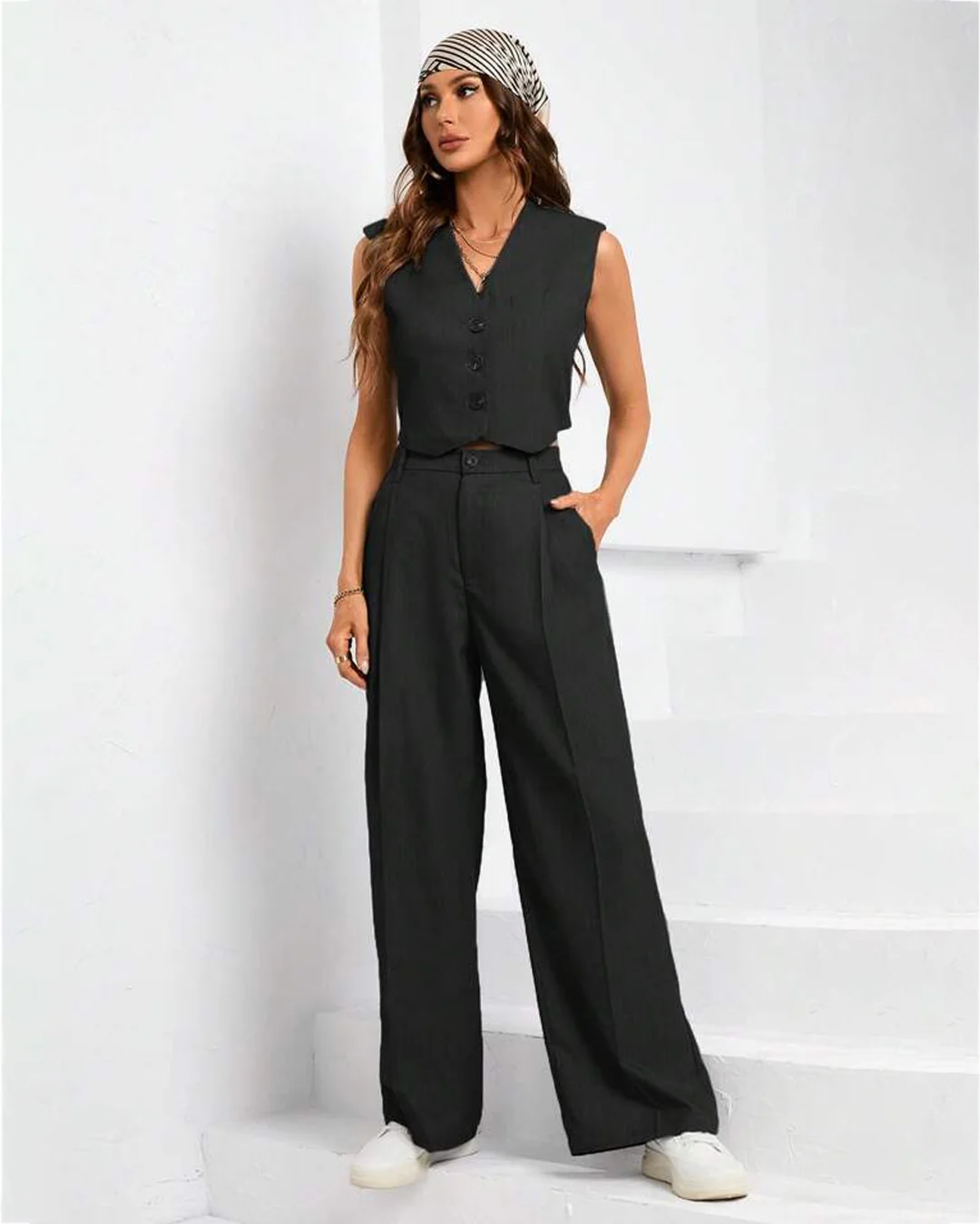 Two-piece tailored suit pants with vest coat in Black is the stylish and hottest pick. This set includes tailored pants and a matching vest coat, perfect for a busy day at the office.