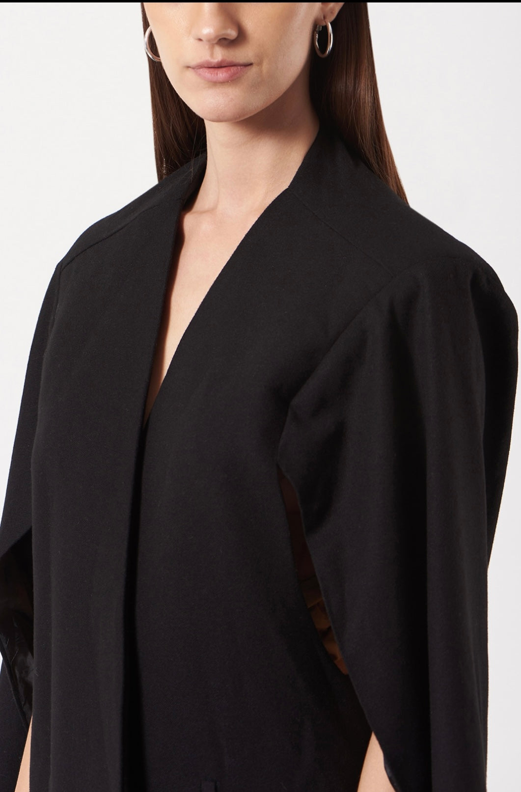 Tailored cape blazer in woven fabric, straight cut with peak lapels, shoulder pads, front flap pockets, decorative buttons with a bold lining.